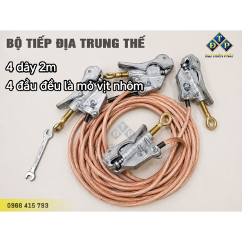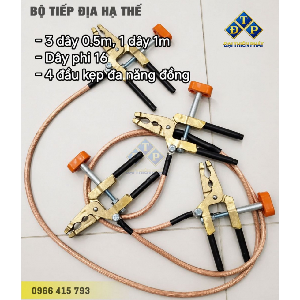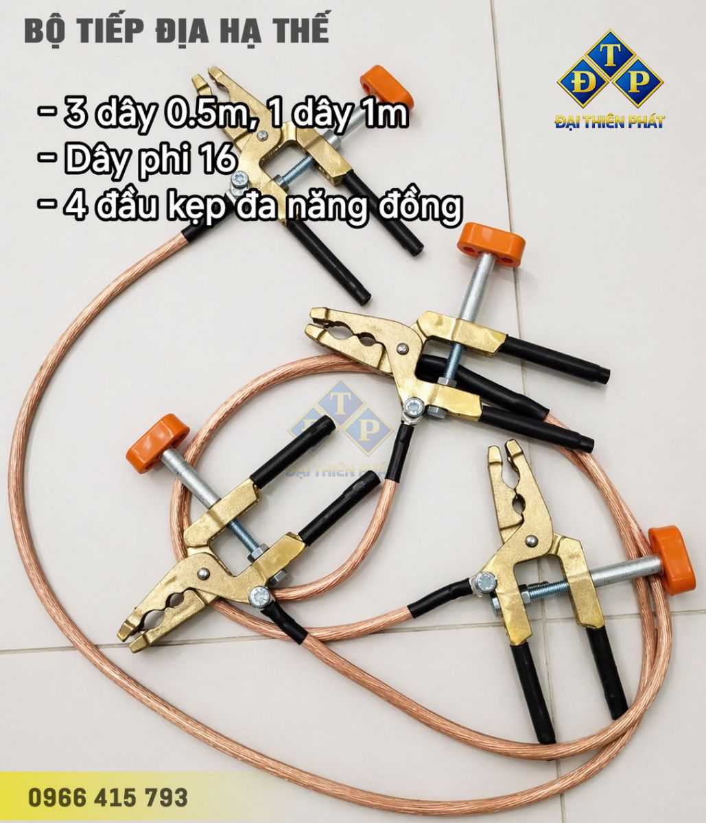 - Bộ sản phẩm tiếp địa hạ áp gồm: Đầu kẹp cái, đầu nối cực, dây tiếp địa, kẹp tiếp địa.